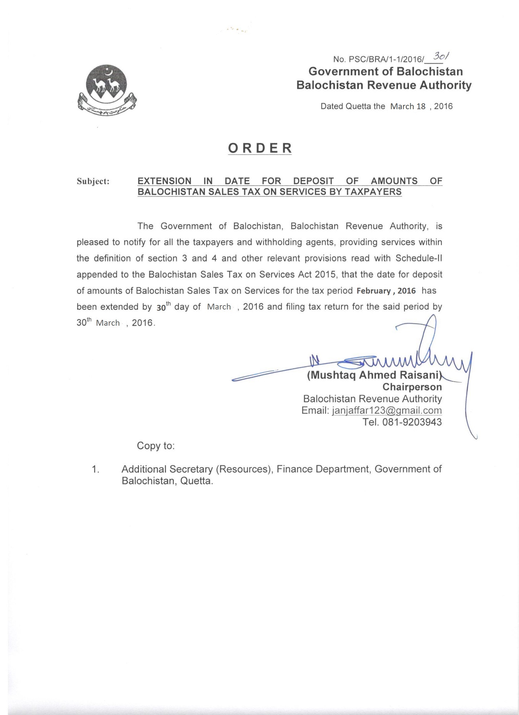 Extension In Date For Deposit Of Amount of Balochistan Sales Tax On Services By Taxpayers 2016