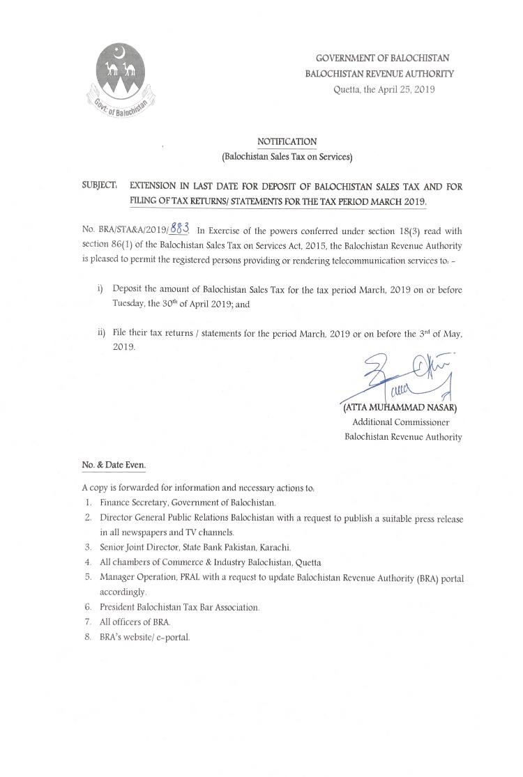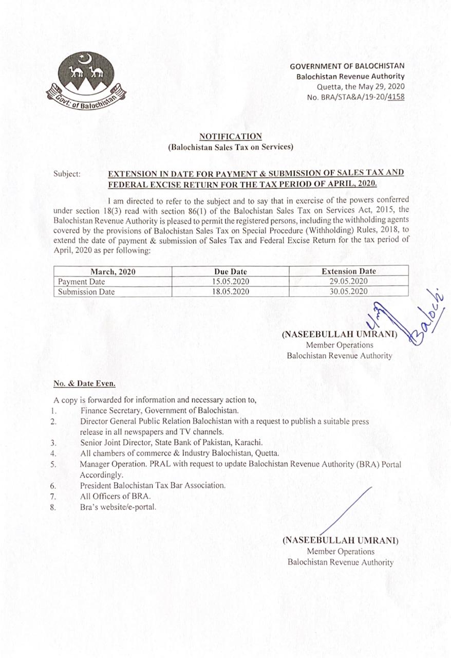 Extension In Date For Deposit Of Amount of Balochistan Sales Tax On Services By Taxpayers
