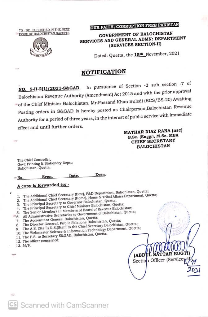 Charge Assumption Report of Mr.Passand Khan Buledi — Notifications_Administration
