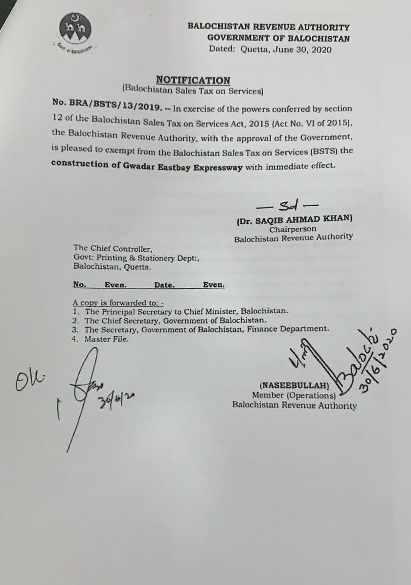 Grant of exemption from payment of BSTS to the construciton of Gwadar Eastbay Expressway