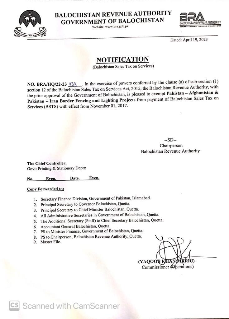 Notification Chairman Balochistan Revenue Authority — Notifications_Administration