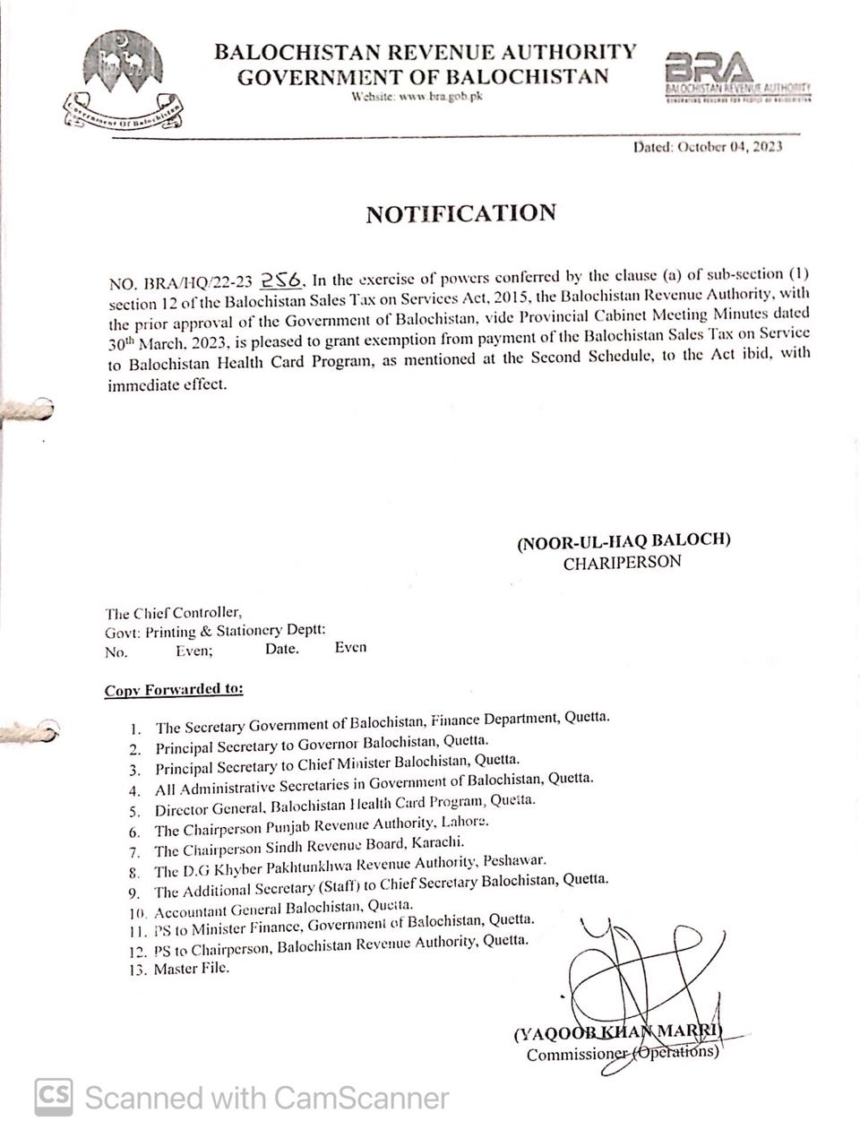 Grant of Exemption from payment of BSTS to Balochistan Health Card Programme — Notifications_SalesTax